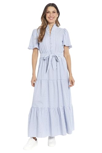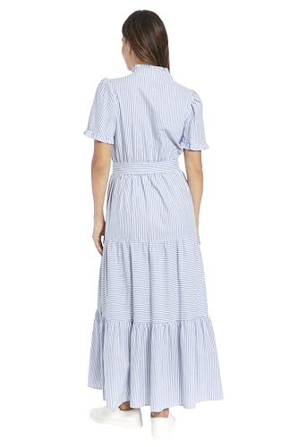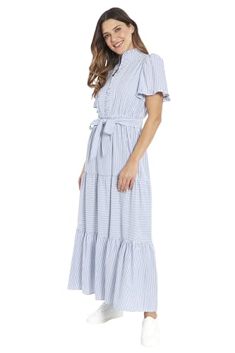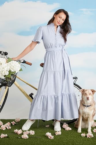 - Enjoy summer vibes in this breezy maxi dress with a high ruffle v-neck front, ruffled short flutter sleeves, waist tie sash, and a tiered floor length skirt.