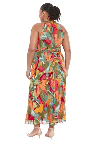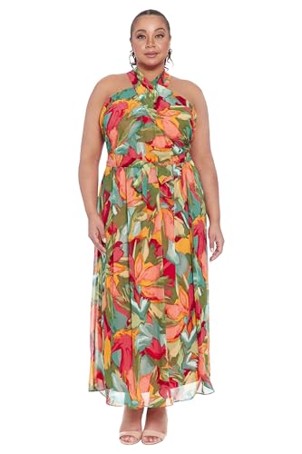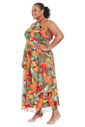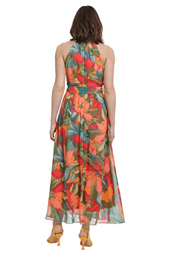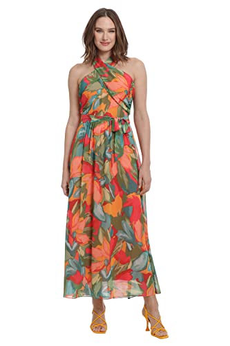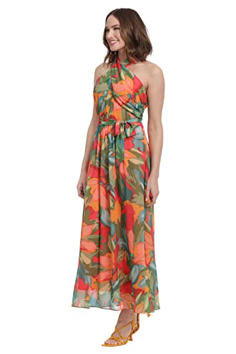 - Twist halter neck, sleeveless, fabric sash tie at waist, and maxi length skirt.